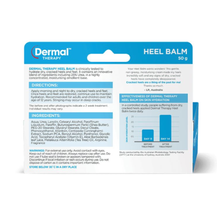 Dermal Therapy Heel Balm Platinum, Formulated to hydrate dry, cracked heels and feet, Dermal Therapy Heel Balm contains a unique formula of 25% Urea in a highly concentrated, moisturising and emollient base to soften dry, cracked heels and feet.