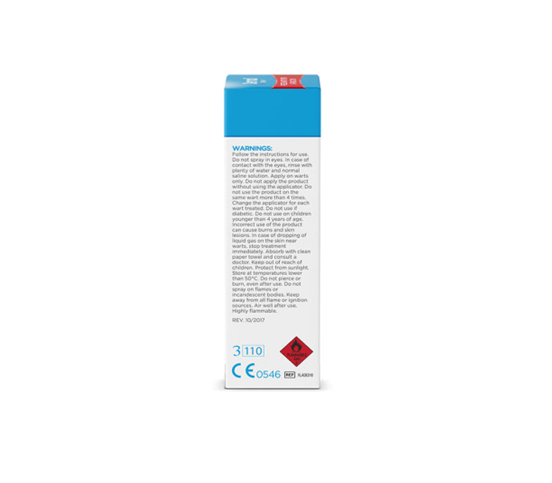 Follow the instructions for use. Do not spray in eyes. In case of contact with the eyes, rinse with plenty of water and normal saline solution. Apply on warts only. Do not apply the product without using the applicator. Do not use the product on the same wart more than 4 times. Change the applicator for each wart treated. Do not use if diabetic. Do not use on children younger than 4 years of age. Incorrect use of the product can cause burns and skin lesions. In case of dropping of liquid gas on the skin near warts, stop treatment immediately. Absorb with clean paper towel and consult a doctor. Keep out of reach of children. Protect from sunlight.