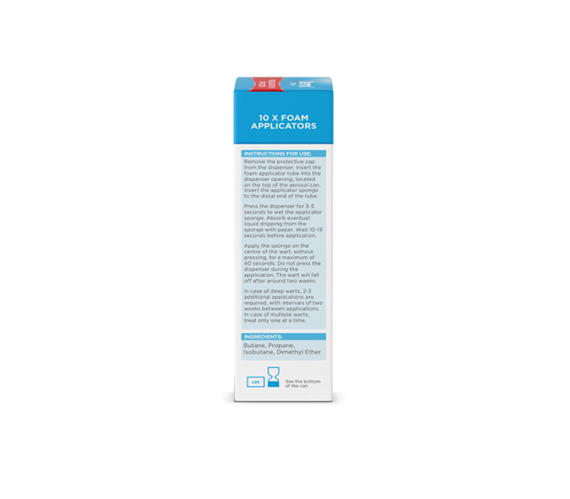 Remove the protective cap from the dispenser. Insert the foam applicator tube into the dispenser opening, located on the top of the aerosol can. Insert the applicator sponge to the distal end of the tube. Press the dispenser for 3-5 seconds to wet the applicator sponge. Absorb with paper eventual liquid dripping from the sponge. Wait 10-15 seconds before application. Apply the sponge on the centre of the wart, without pressing, for a maximum of 40 seconds. Do not press the dispenser during the application. The wart will fall off after around two weeks. In case of deep warts, 2-3 additional applications are required, with intervals of two weeks between applications. In case of multiple warts, treat only one at a time.