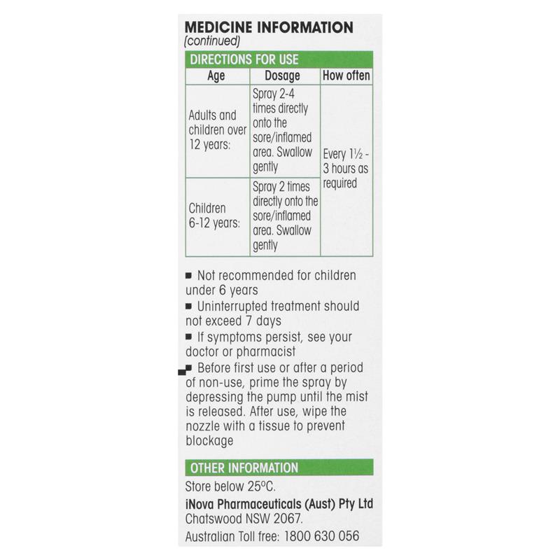 Children 6-12 years: Spray 2 times directly onto the sore/inflamed area. Swallow gently. Every 1 1/2-3 hours as required.