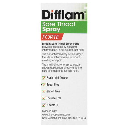Difflam Forte Anti-Inflammatory Sore Throat 88 Spray offers fast, targeted relief from sore throats. The anti-inflammatory action targets the site of inflammation to reduce swelling and pain. The multi-directional spray nozzle allows application directly onto the sore inflamed area for fast relief.