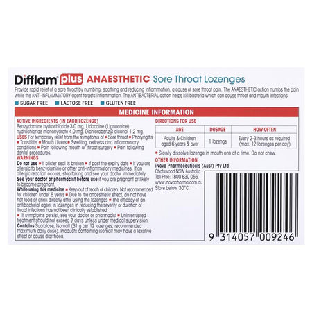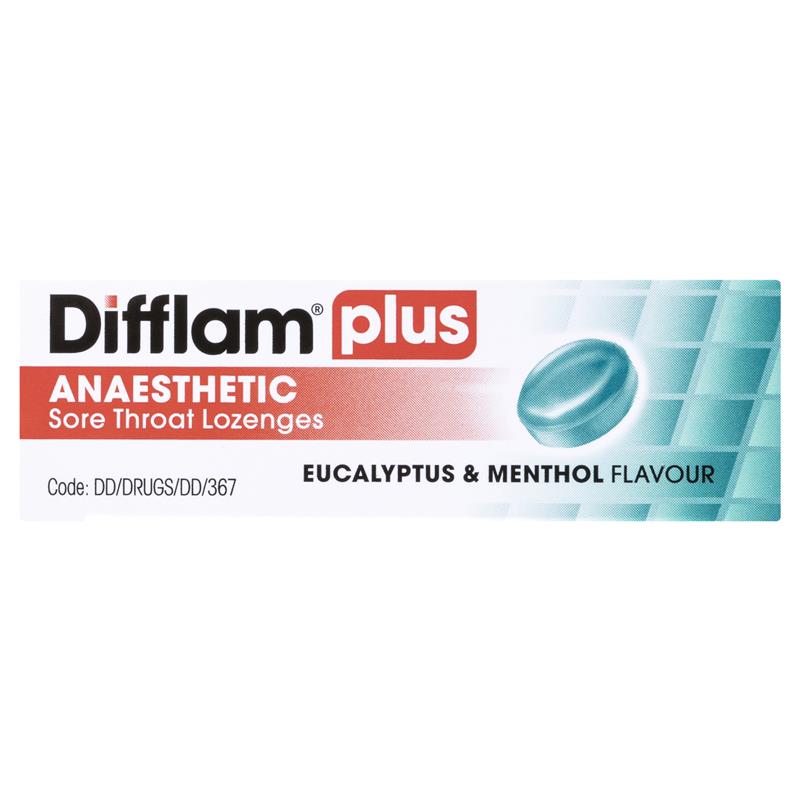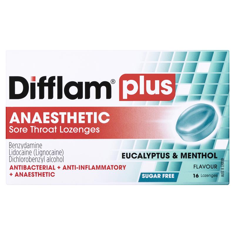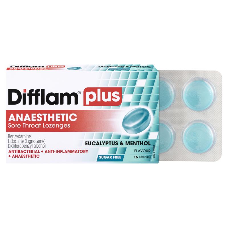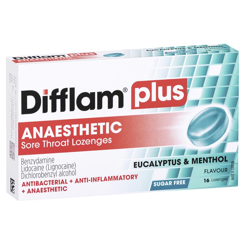Difflam Plus Anaesthetic Sore Throat Lozenges Eucalyptus & Menthol Flavour has a triple action antibacterial + anti-inflammatory + anaesthetic formula for fast numbing relief of a sore throat.