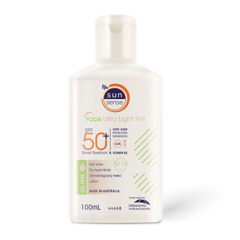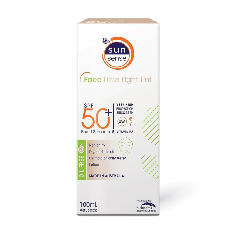 Ego SunSense Face Ultra Light Tint SPF 50+, Apply this invisible, matte, sheer tint sunscreen to your face and neck for daily sun protection. It features broad spectrum coverage from harmful UVA and UVB rays. Oil-free and non-shiny with a dry-touch finish, it’s been dermatologically tested and is suitable for all skin types. Contains Vitamin E and Nicotinamide (Vitamin B3) to help moisturise and visibly improve skin texture. Australian made and owned.