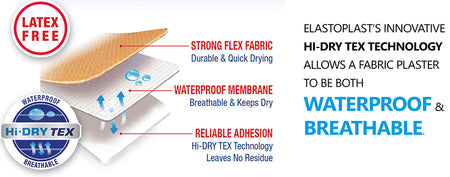 Elastoplast developed this three-layer technology for improved wound protection. Hi-DRY TEX technology makes the plaster waterproof, breathable and ensures strong adhesion, due to its integrated coverage of flexible fabric and a waterproof, yet breathable membrane. The flexible fabric ensures not only utmost comfort for you, but also protection from moisture and water for your wound.