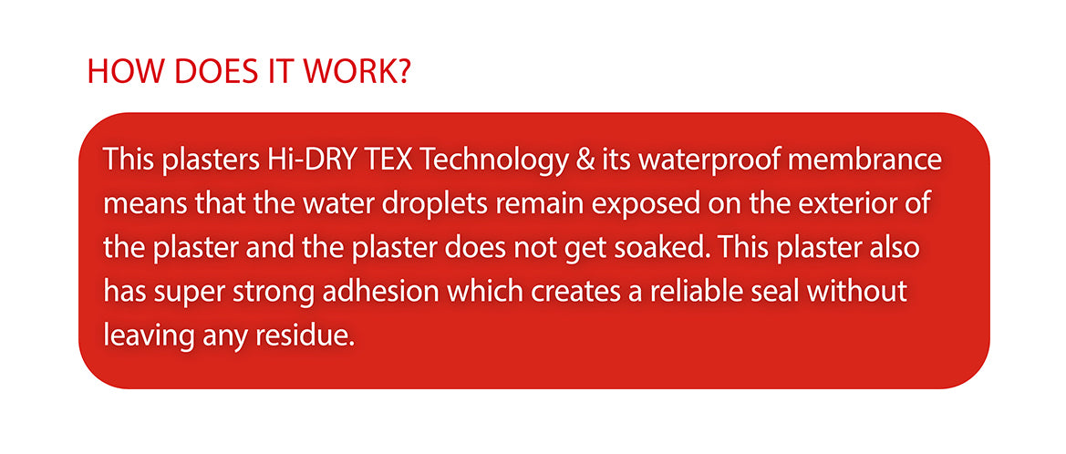 Hi-DRY TEX technology stands for a new innovative plaster technology. The only extra resistant, breathable and waterproof fabric plaster that gives the wound maximum protection even under the most difficult circumstances. The 3 layer protective plaster combines a tough, flexible fabric that dries quickly with a waterproof yet breathable membrane that keeps the wound dry. The extra strong adhesive ensures optimal protection and can be removed without leaving residues.