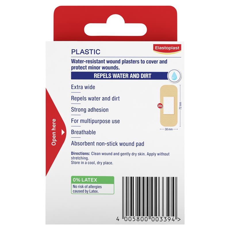 Elastoplast Plastic Strips Extra Wide repels water and dirt with strong adhesion and bacteria shield (Protects against dirt & bacteria). Water-resistant wound plasters to cover and protect minor wounds.