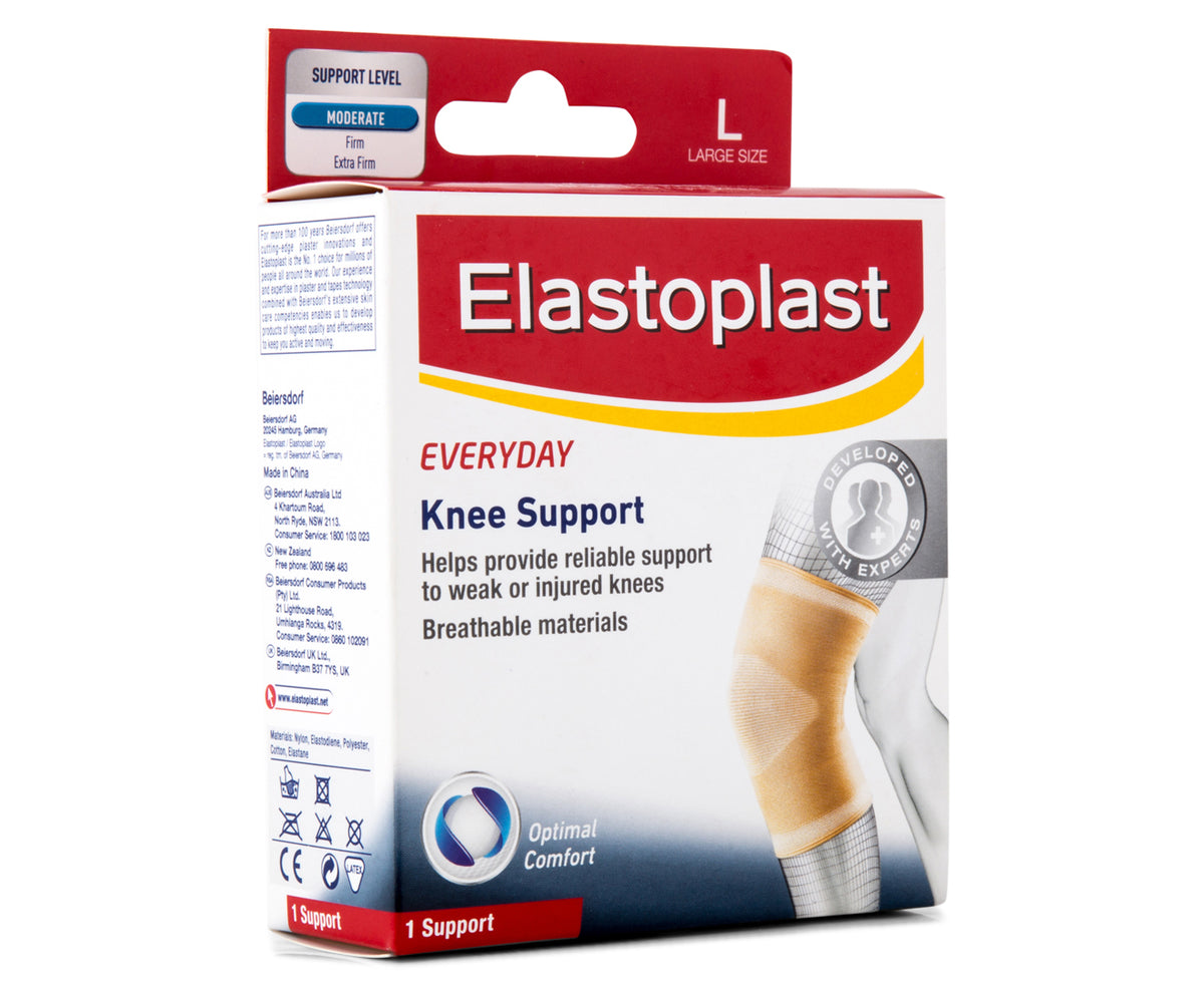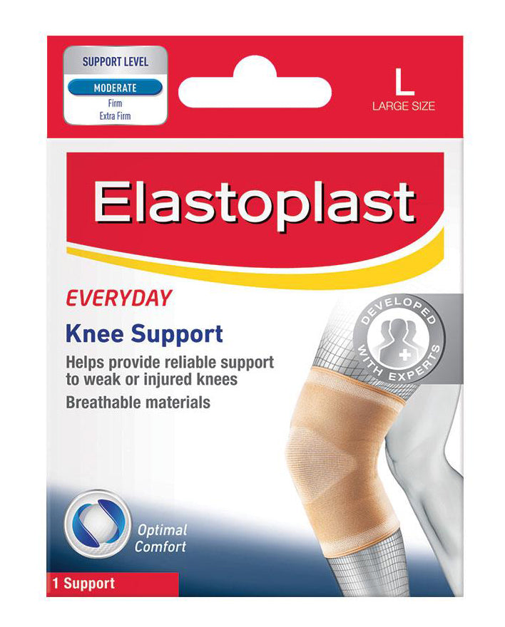 Elastoplast Sport Knee Support provides basic support for weak or injured knees. The breathable material can be worn comfortably all day, providing moderate compression and warmth. Warmth can reduce discomfort or swelling that may be present in and around the knee joint and tendons.
