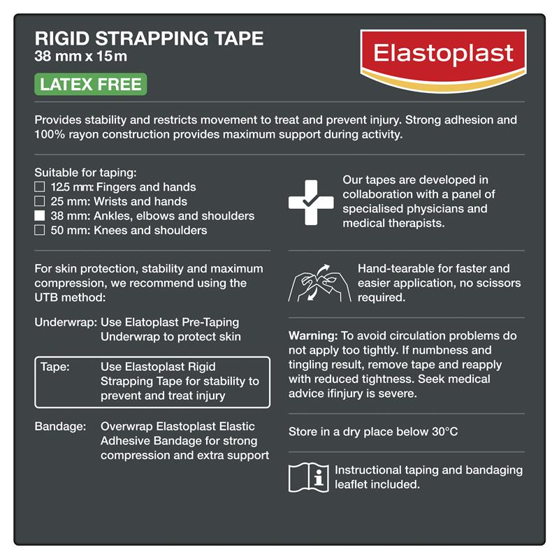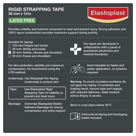 Elastoplast Sport Rigid Strapping Tape is a robust supportive tape, which is suitable for stabilising joints during vigorous physical activity, to support and prevent joint injury. By restrictive excessive movement of joints & ligaments, it stabilises the area to help alleviate pain. It can be used to treat moderate to severe, joint and ligament sprains, strains or tears, to provide extra support during recovery.