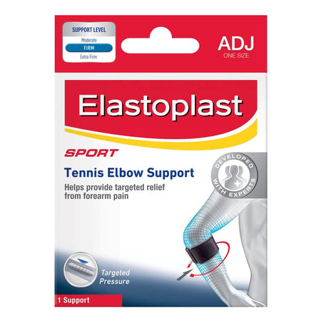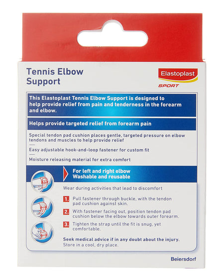 Elastoplast Sport Tennis Elbow Support helps relieve symptoms of epicondylitis (better known as Tennis/Golfer’s Elbow) by stabilising the forearm. Provides localised compression and warmth that aids general pain and tenderness in the forearm and elbow.