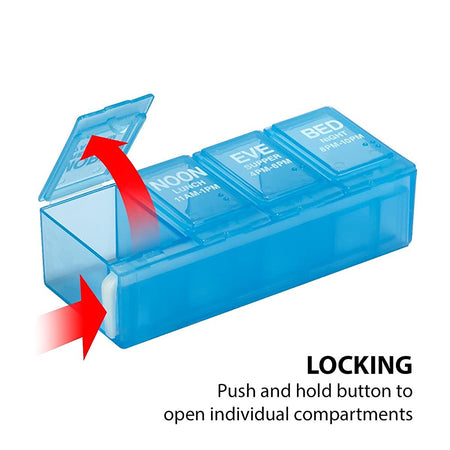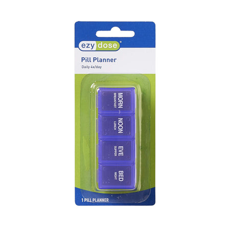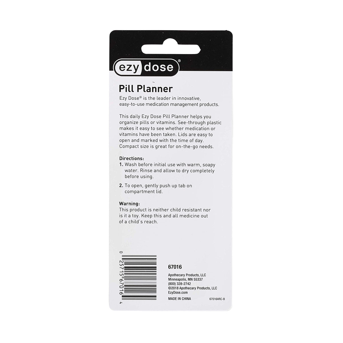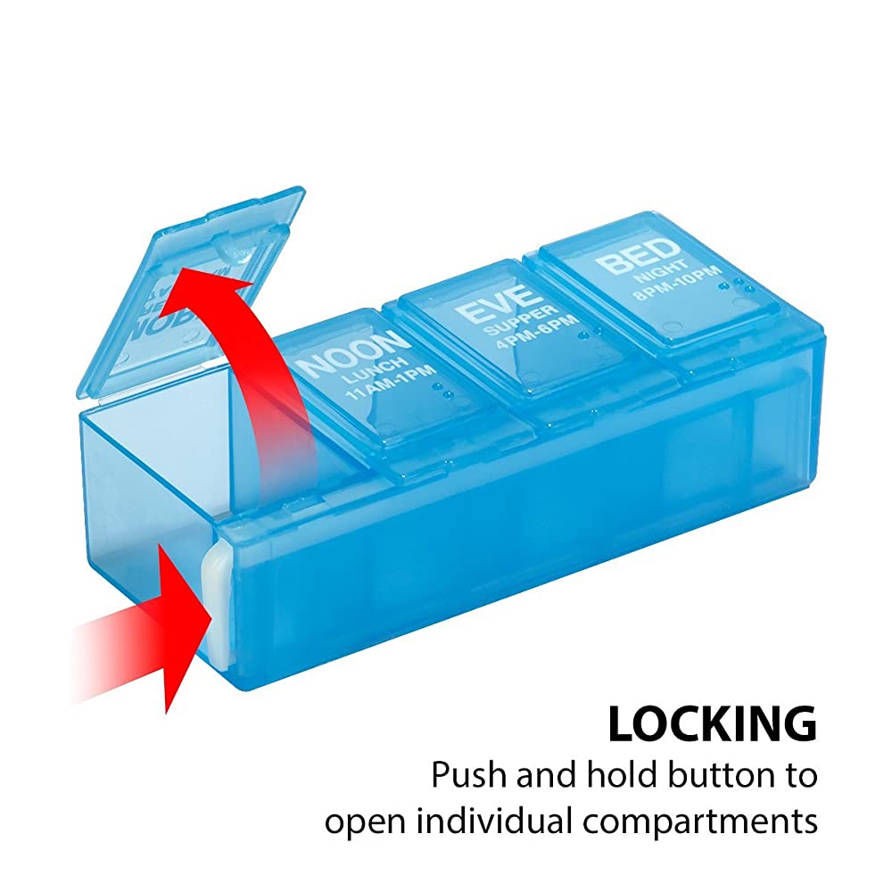 Ezy Dose 4 Times a Day 7-Day Pill Push Button Lid Organizer - this weekly pill organizer is perfect for scheduling frequent doses of your week's medication. Removable and spacious compartments are simple to use and help you keep track of your medication through the week. This weekly pill planner is designed for easy use.