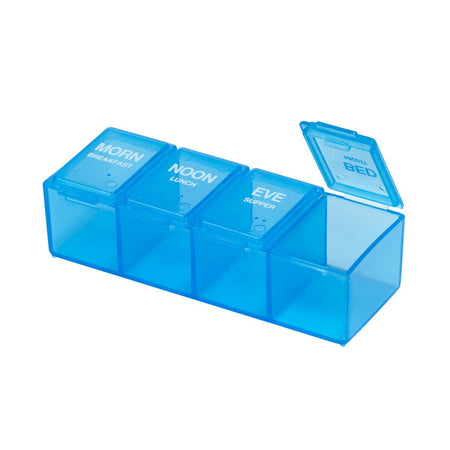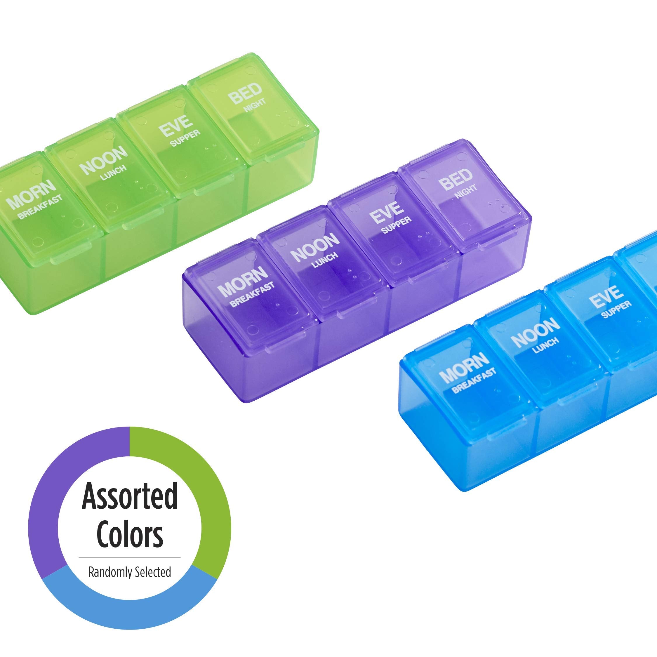 Its contoured bottoms make removing medication simple. Each day has 4 compartments for planning frequent daily doses. The daily compartments can be removed and taken on the go.