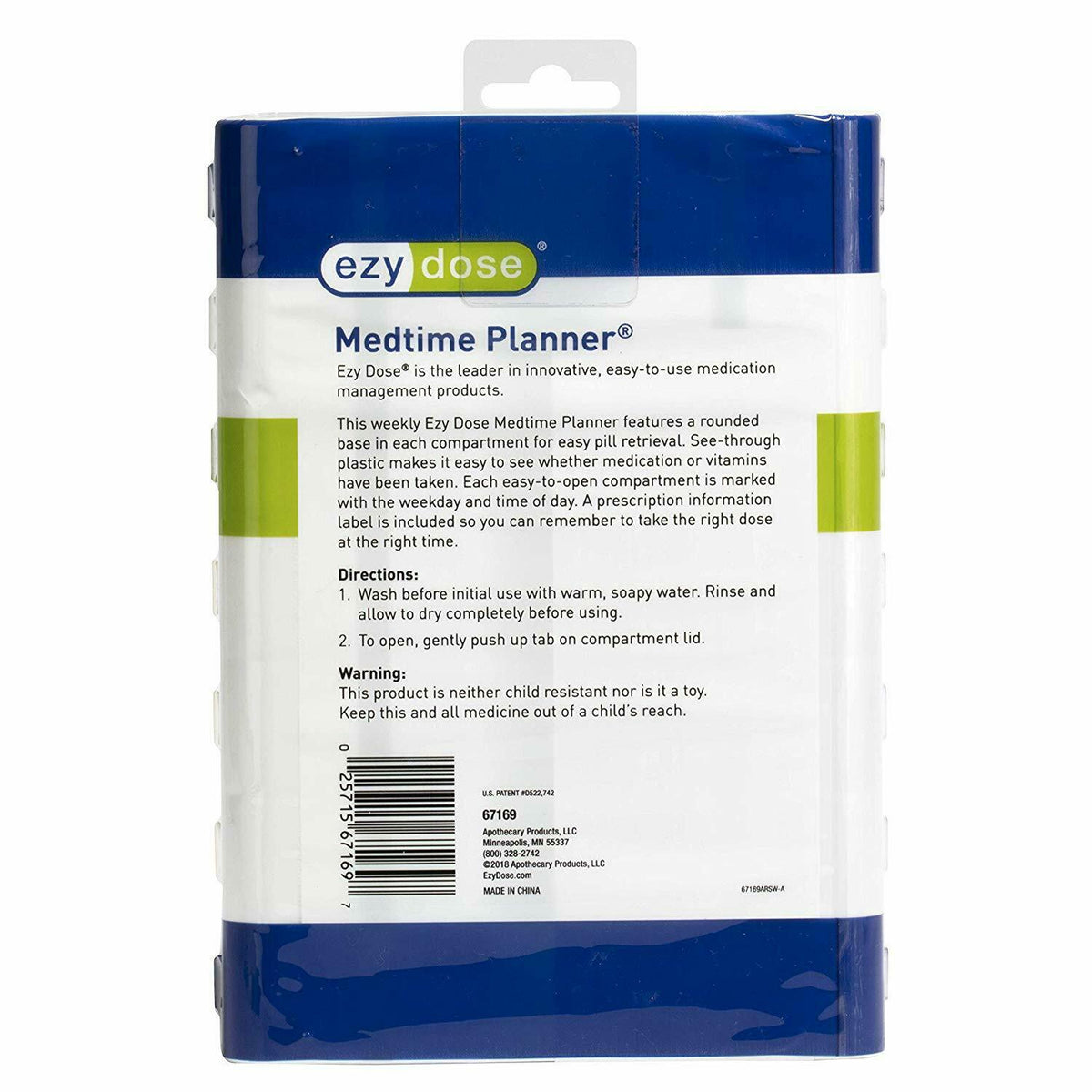 This weekly Ezy Dose Medtime Planner features a rounded base in each compartment for easy pill retrieval. See-through plastic makes it easy to see whether medication or vitamins have been taken. Each easy-to-open compartment is marked with the weekday and time of day. A prescription information label is included so you can remember to take the right dose at the right time.