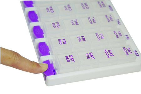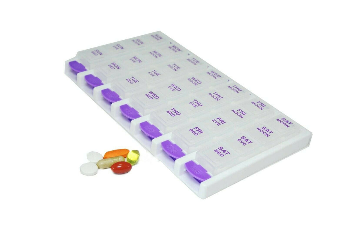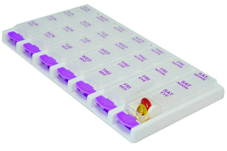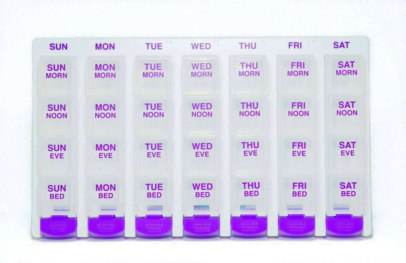 Ezy Dose One-Day-At-A Time Pill Planner Case, this planner has a tray that holds 7 separate pill planners for each day of the week. Each planner has four compartments for throughout the day. This medication reminder is perfect for taking your medication on the go and is easy to use.