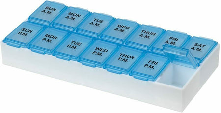 Seven day morning and afternoon pill reminder. Never forget a dose again! Separate AM and PM compartments hold one week of medication, assorted colours (randomly selected) include blue, green, purple, red and yellow.