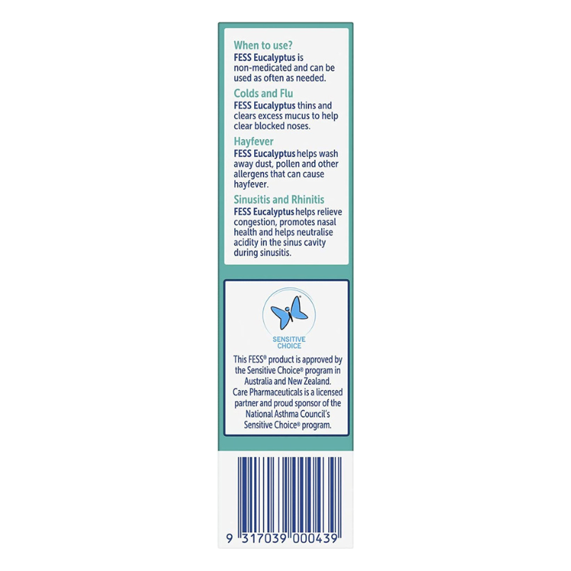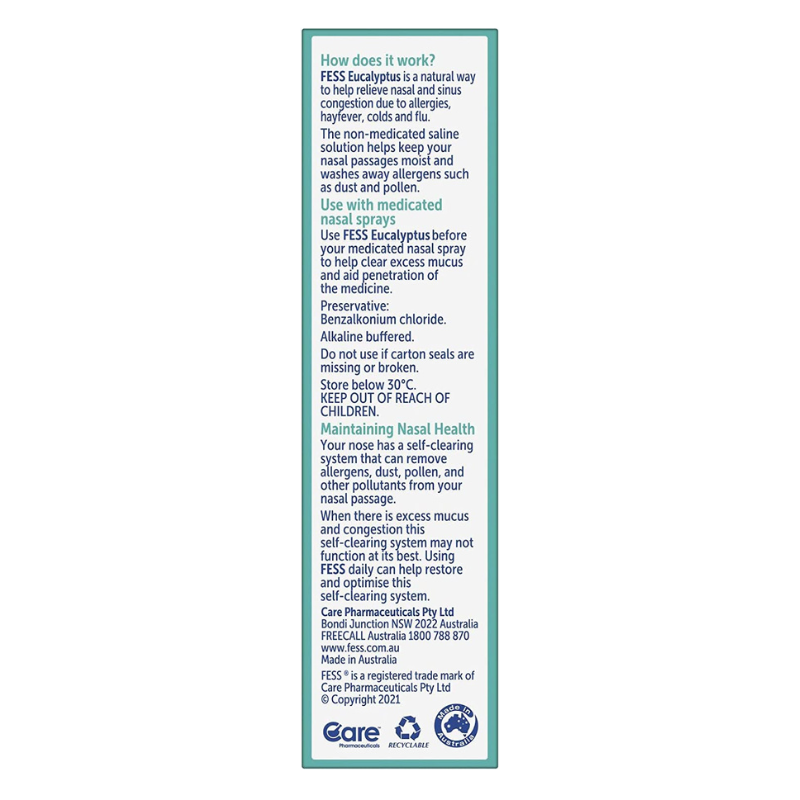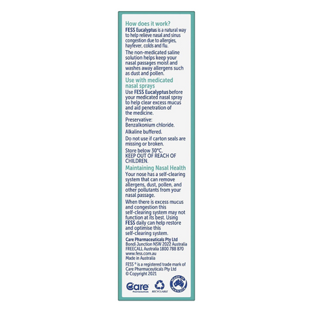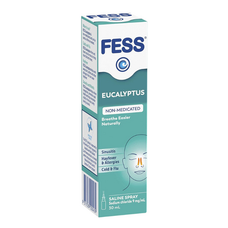 FESS Eucalyptus helps relieves nasal congestion due to allergies, hayfever, colds and flu. The non-medicated saline solution keeps your nasal passages moist and washes away allergens such as dust and pollen.