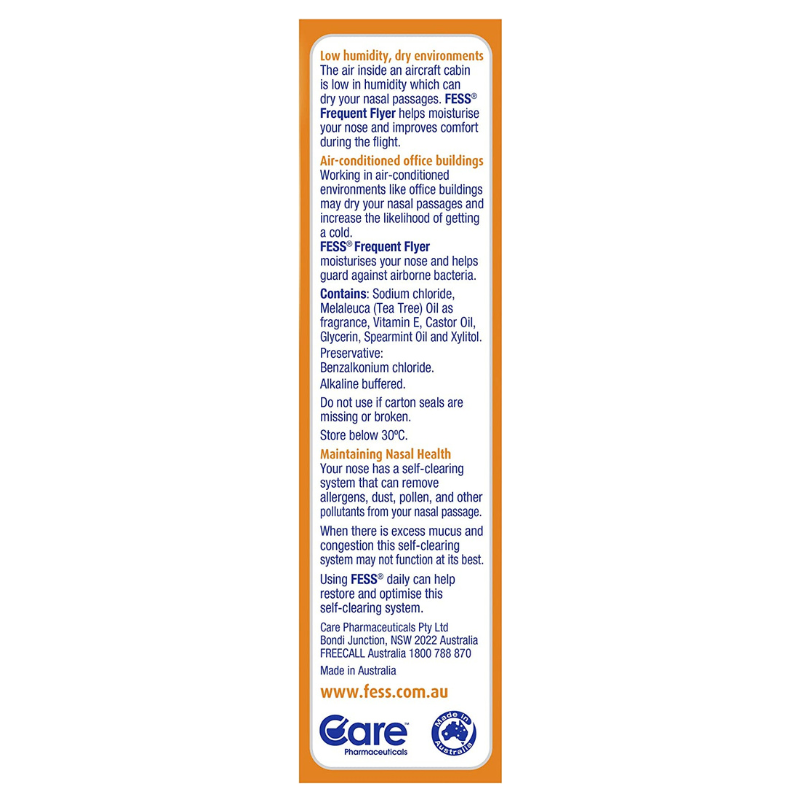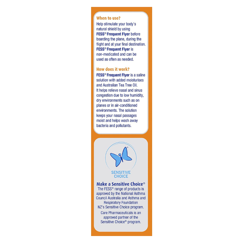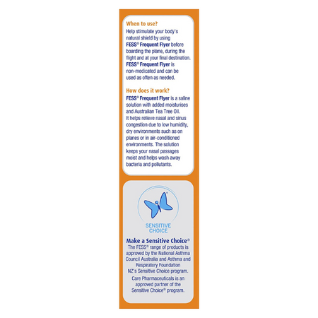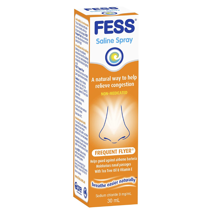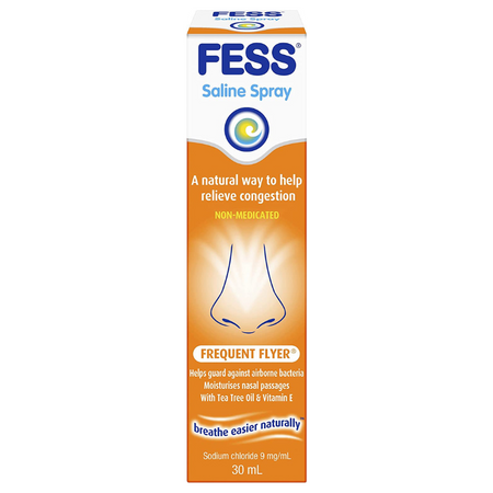 FESS Nasal Defence helps relieve nasal congestion due to low humidity, dry environments such as on planes or in air-conditioned environments. The solutions keeps your nasal passages moist and helps wash away bacteria pollutants. FESS Nasal Defence helps moisturise your nose, which helps guard against airborne infections, such as the common cold, handy for when you’re catching public transport or are in other crowded areas.