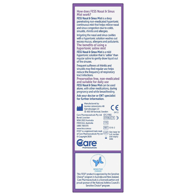 FESS® Nasal & Sinus Mist should not be taken orally and should be kept out of reach of children. Do not use if your nasal passages are completely blocked or if you have an ear infection. If symptoms are not relieved within 2 days, consult your healthcare professional. If your doctor or pharmacist does not recommend FESS® Nasal & Sinus Mist for your child, Children’s FESS® or FESS Little Noses® may be suitable. Do not use after the expiry date.