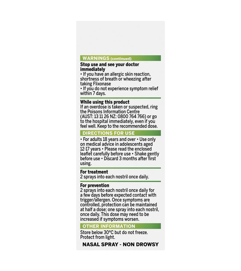Until you have read the enclosed leaflet carefully. Flixonase contains the following preservatives Phenethyl alcohol 250mcg/Spray and Benzalkonium chloride 20 mcg/spray.