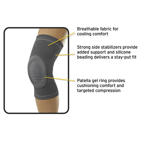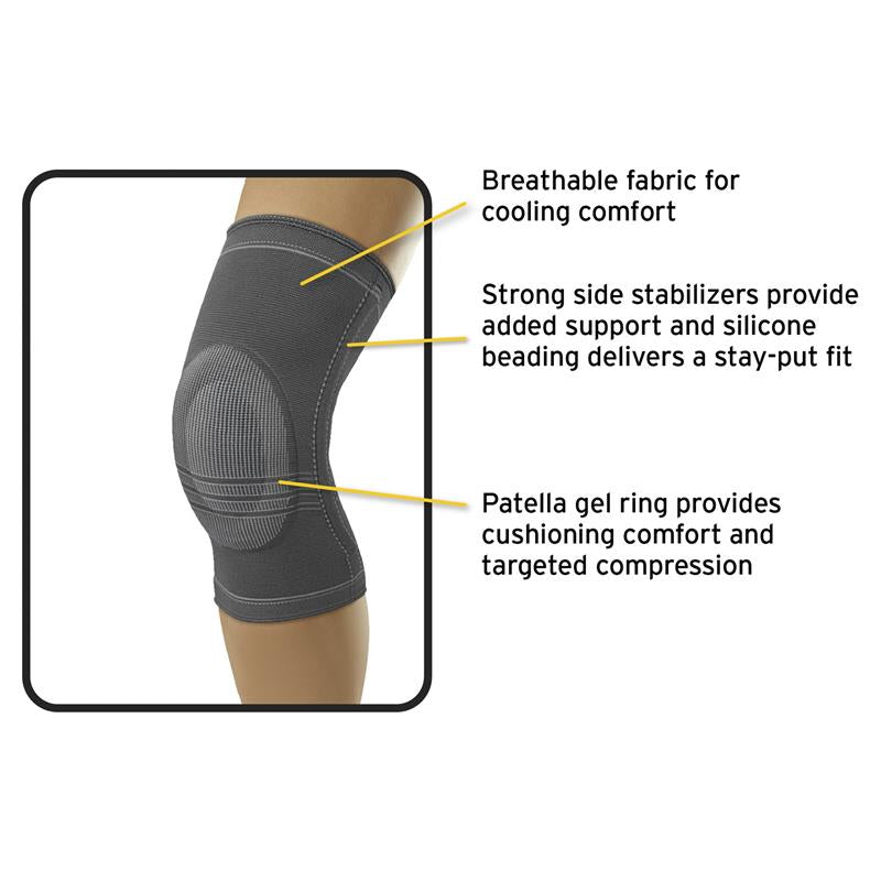 - Four-way, stretch-knit fabric conforms to your knee for comfort and moderate-stabilizing support