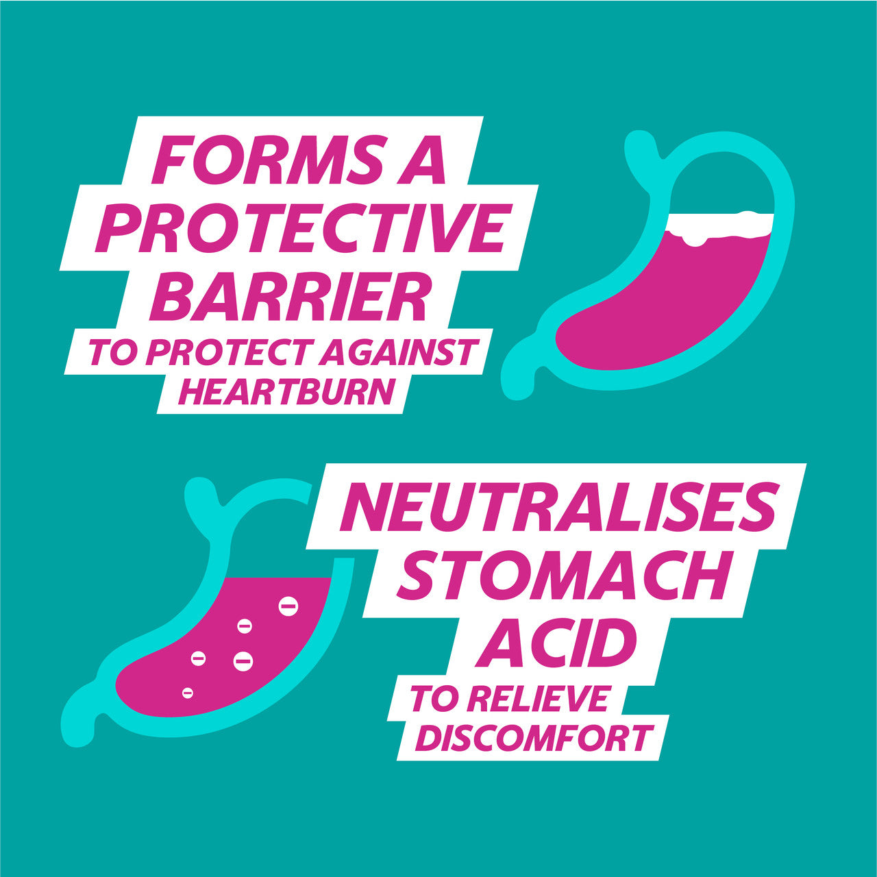 Gaviscon Dual Action works in two different ways to effectively relieve the symptoms of heartburn and indigestion: