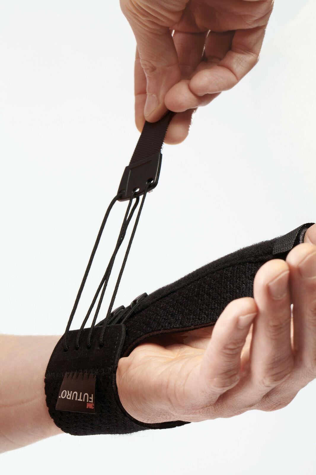 - Open hook-and-loop wrist strap and thumb strap. Slide hand into brace and thumb into thumb hole.