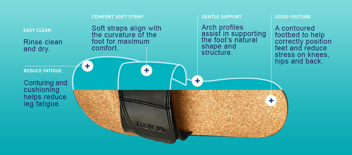 Maseur® helps promote healthy posture, balance and alignment. The unique contoured footbed provides support for arches, heels and toes and helps correctly position feet to relieve pressure on the knees, hips and backs. Features:
