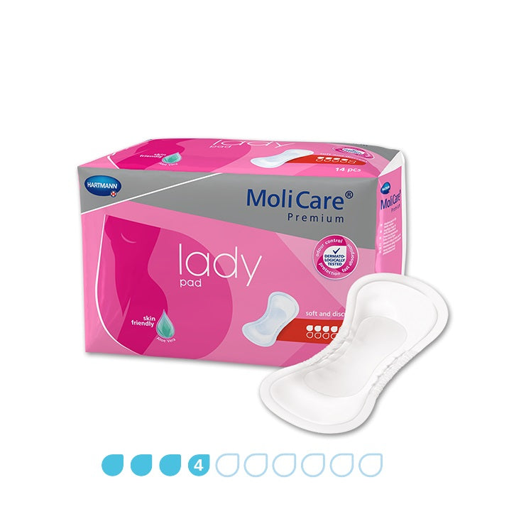 MoliCare Premium Lady Pad 4 Drops are designed to provide a perfect fit to the female anatomy ensuring comfort and security. The 3 drop is ideal for those small drips and dribbles. It contains skin friendly Aloe Vera as well as a 3-layer absorbent core that pulls fluid away from the surface, so the skin stays dry, healthy and free from odours.