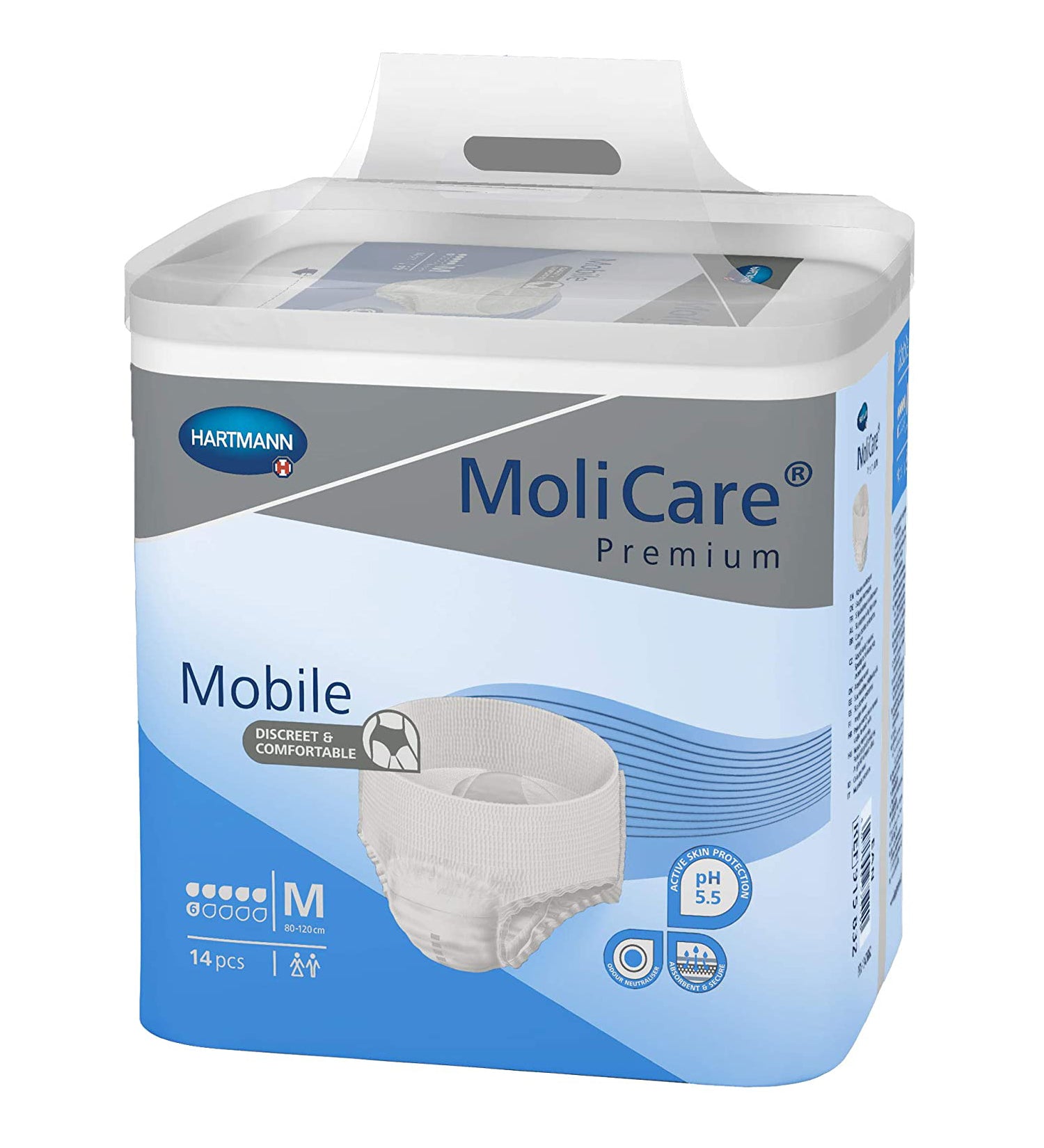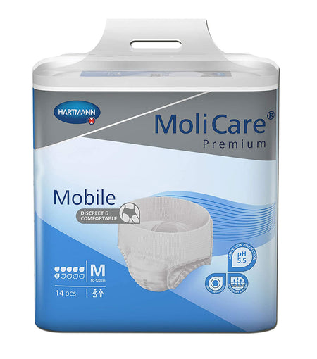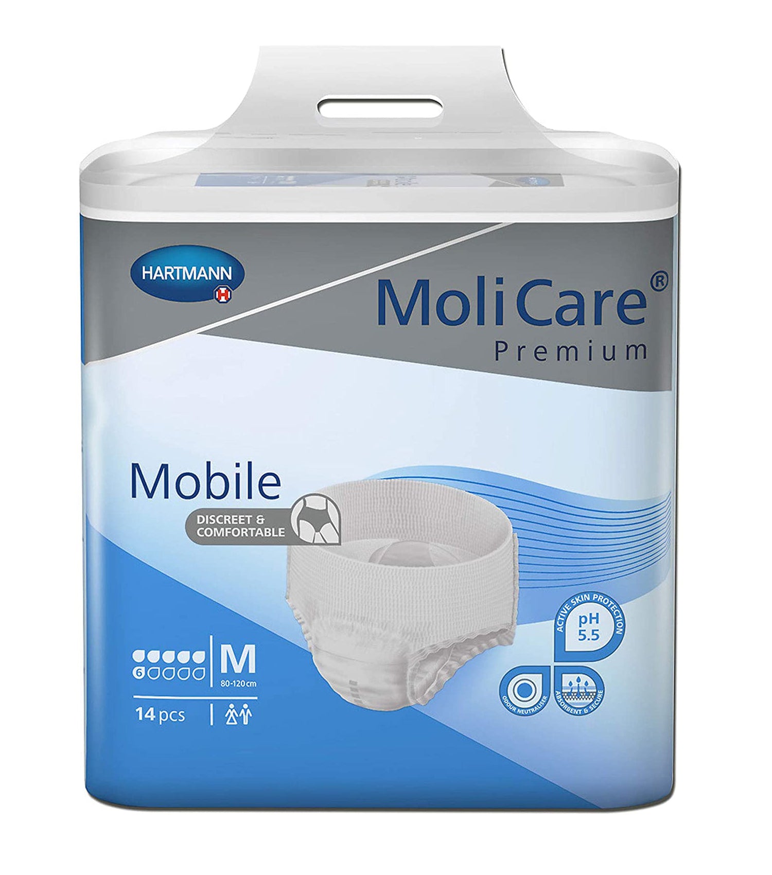 MoliCare Premium Mobile 6 Drops Medium a skin friendly pull-up pant for moderate to heavy incontinence which looks and feels like normal underwear whilst offering the highest level of leakage protection.