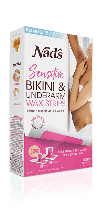 Nad’s Hair Removal Sensitive Bikini & Underarm Wax Strips use a soft, flexible, hypoallergenic strip that conforms to those hard to reach areas to remove even the short hairs by the root. Each box includes two easy to use wax strip sizes for Bikini and Underarm. Quick, simple, effective hair removal at home or on the go for smooth skin for up to 8 weeks. Just Rub, Peel and Go!
