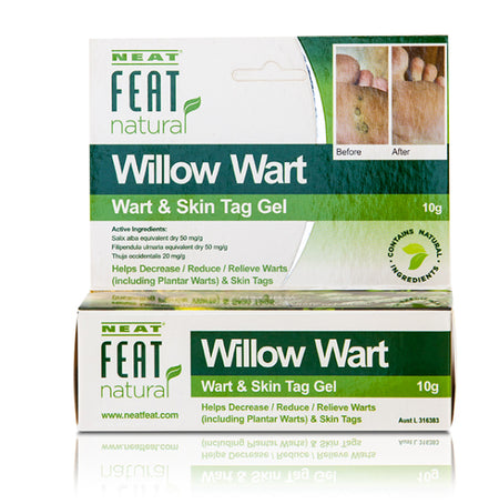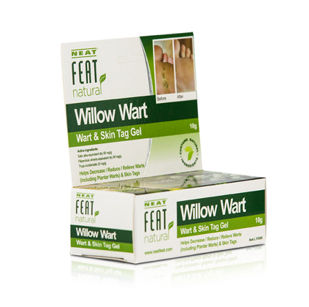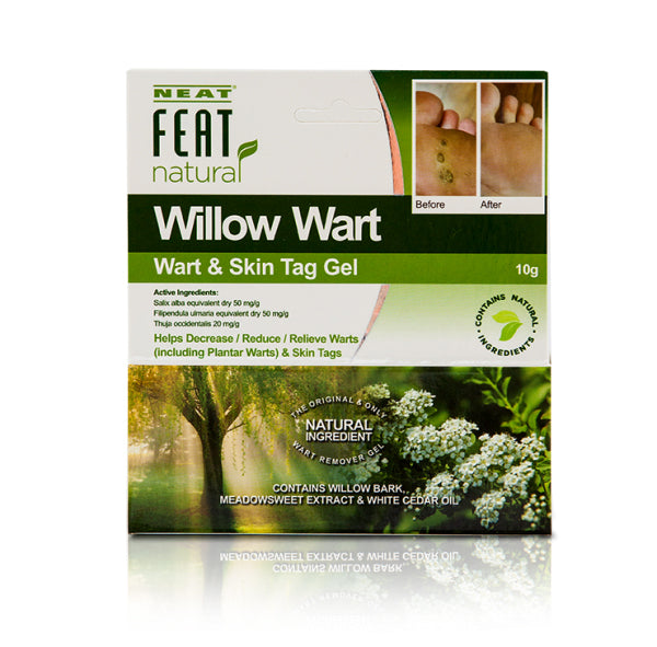 Natural Wart & Skin Tag Gel is comprised of natural plant extracts, based on a formula traditionally used in herbal medicine containing natural ingredients. Neat Feat Willow Wart Will Help Decrease, Reduce, Relieve Warts (including Plantar Warts) & Skin Tags. Neat Feat Natural Willow Wart is the original and only natural ingredient Wart Remover Gel. It contains Willow Bark Meadowsweet Extract & White Cedar Oil.