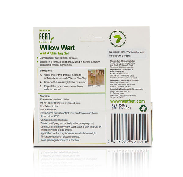 Keep Out of Reach of Children. Do Not Apply to Broken or Irritated Skin. For External Use Only. Not to be Taken. If Symptoms Persist Contact Your Healthcare Practitioner. Store Below 30°C. Contains Methyl Salicylate. Do Not Use if Pregnant or likely to become pregnant. Do Not Use Neat Feat Willow Wart, Wart & Skin Tag Gel on Children 6 Years of Age or Less. Application to Skin May Increase Sensitivity to Sunlight. If Irritation Develops – Discontinue Use. Avoid Prolonged Exposure in the Sun.