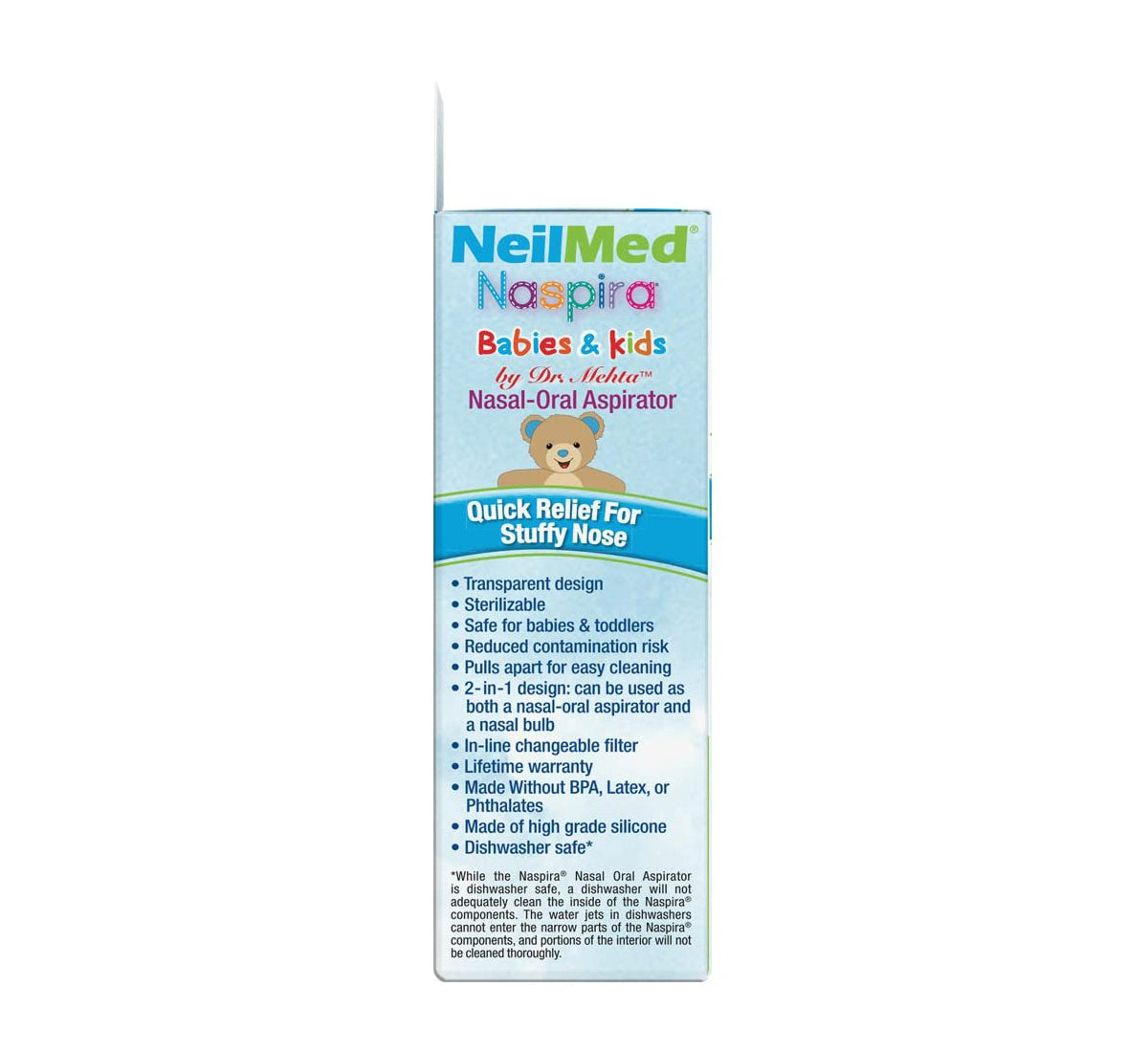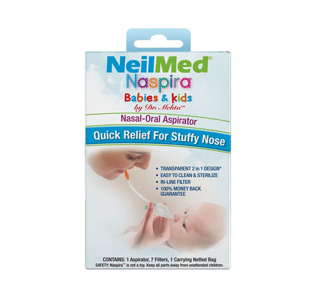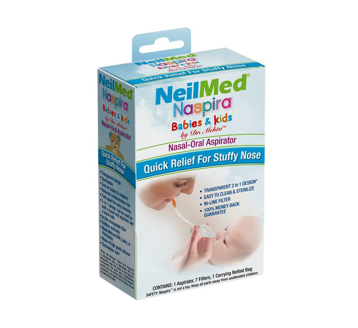 Purpose of Naspira Nasal Oral Aspirator: NeilMed Naspira safely and effectively suctions baby's and toddler's stuffy, runny or congested noses, helping them breathe more easily. Babies and toddlers often experience these symptoms, which result from upper respiratory tract infections and other causes. Small children are unable to blow their noses until they are 4 to 5 years of age and suffer from impaired breathing, feeding, eating, unsound sleep and several generalized symptoms.