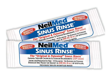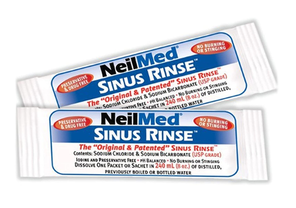 Always rinse your nasal passages with NeilMed Sinus Rinse packets only. Our packets contain a mixture of USP grade sodium chloride and sodium bicarbonate. These ingredients are of the purest quality available to make the dry powder mixture. Rinsing your nasal passages with only plain water without our mixture will result in a severe burning sensation as the plain water is not physiologic for your nasal lining, even if it is appropriate for drinking. Additionally, for your safety, do not use tap or faucet water for dissolving the mixture unless it has been previously boiled for five minutes or more as boiling sterilizes the water. Other choices are distilled, micro-filtered (through 0.2 micron), commercially bottled or, as mentioned earlier, previously boiled water at lukewarm or body temperature. You can store boiled water in a clean container for seven days or more if refrigerated. Do not use non-chlorinated or non-ultra (0.2 micron) filtered well water unless it is boiled and then cooled to lukewarm or body temperature. Do not rinse if your nasal passages are completely blocked or if you have an ear infection or blocked ears. If you have had recent ear or sinus surgery, contact your physician prior to irrigation. If you experience any pressure in the ears or burning in the nasal passages, stop irrigation and get further directions from your physician. Keep out of reach of children. Read and retain this enclosed brochure for instructions and other important information.