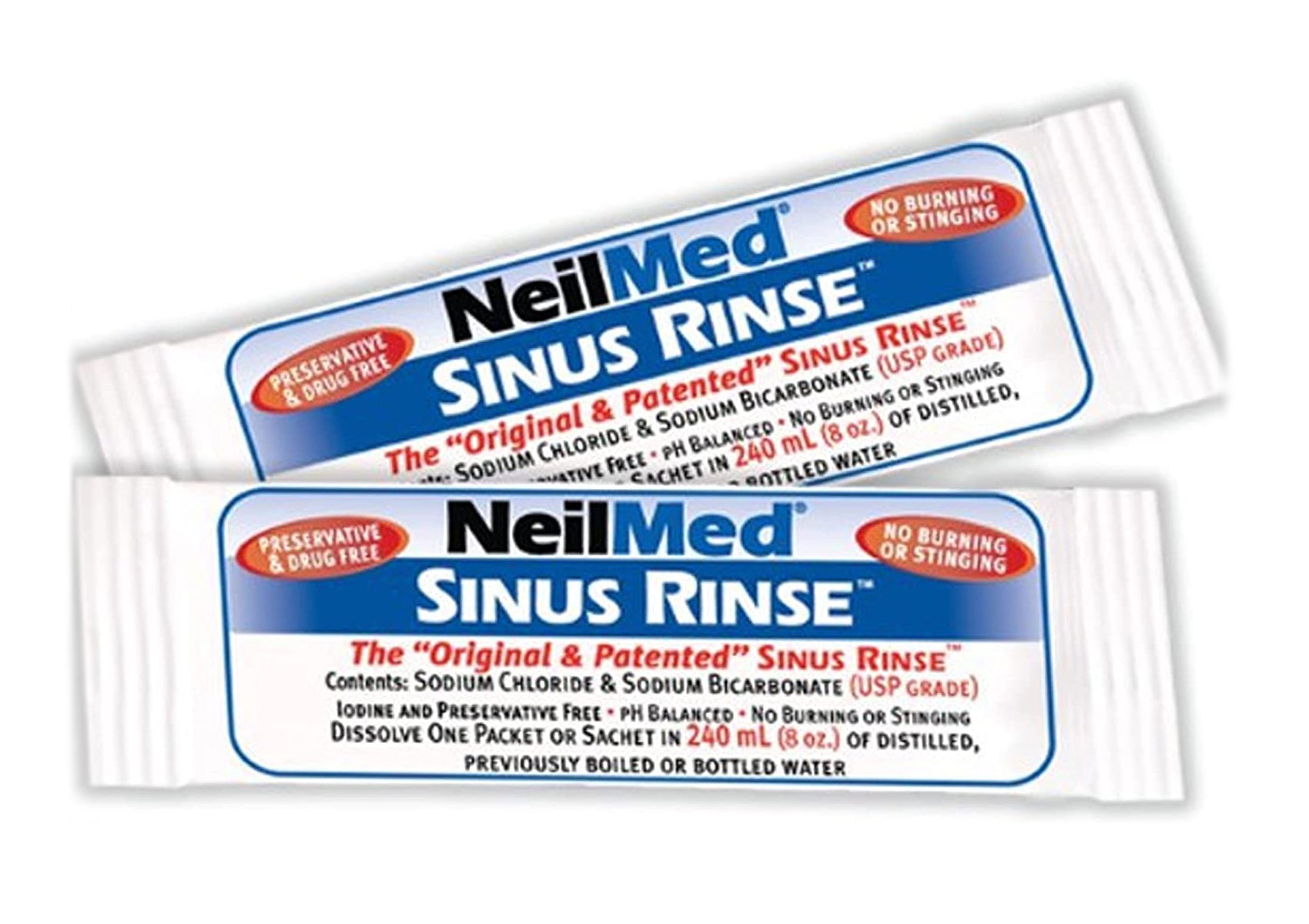 Rinse your nasal passages only with NeilMed Sinus Rinse packets. Our packets contain a mixture of USP grade sodium chloride and sodium bicarbonate. These ingredients are the purest quality available to make the dry powder mixture. Rinsing your nasal passages with only plain water will result in a severe burning sensation. Use distilled, micro-filtered (through 0.2 micron), commercially bottled or previously boiled & cooled down water at lukewarm or body temperature, properly mixed with NeilMed Sinus Rinse packets. Do not use tap or faucet water for dissolving the mixture unless it has been previously boiled and cooled down. Do not rinse if nasal passages are completely blocked or if you have an ear infection or blocked ears.