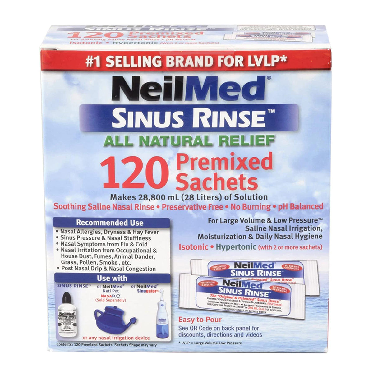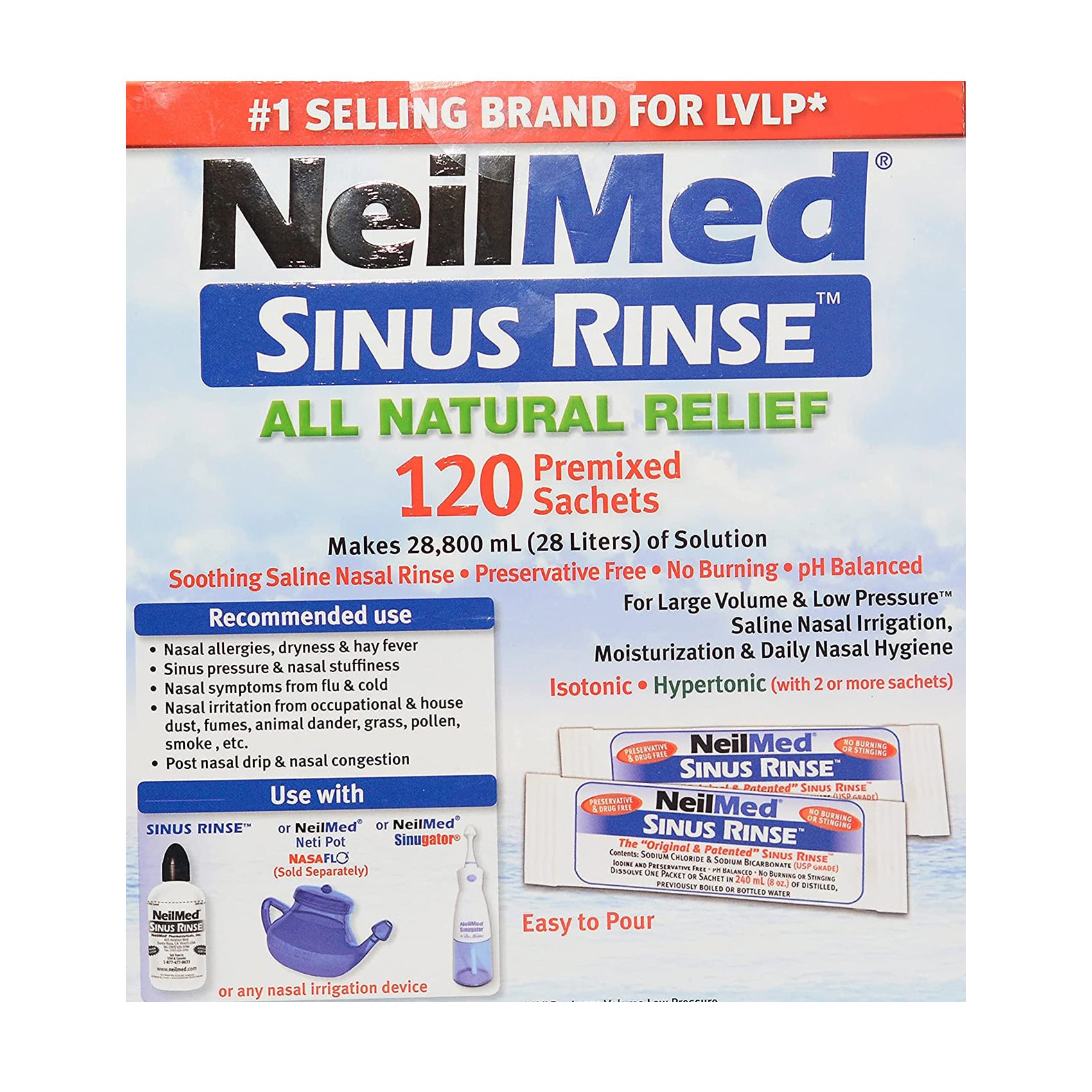 The NeilMed Sinus Rinse system is a large volume nasal rinse that will deliver 120mL to 240mL(8 fl oz) of saline solution into the nasal passages. Adding one blue packet of NeilMed Sinus Rinse to 240mL(8 fl oz) of water will make an Isotonic saline solution (Hypertonic with 2 or more packets) that is pH balanced and preservative free.