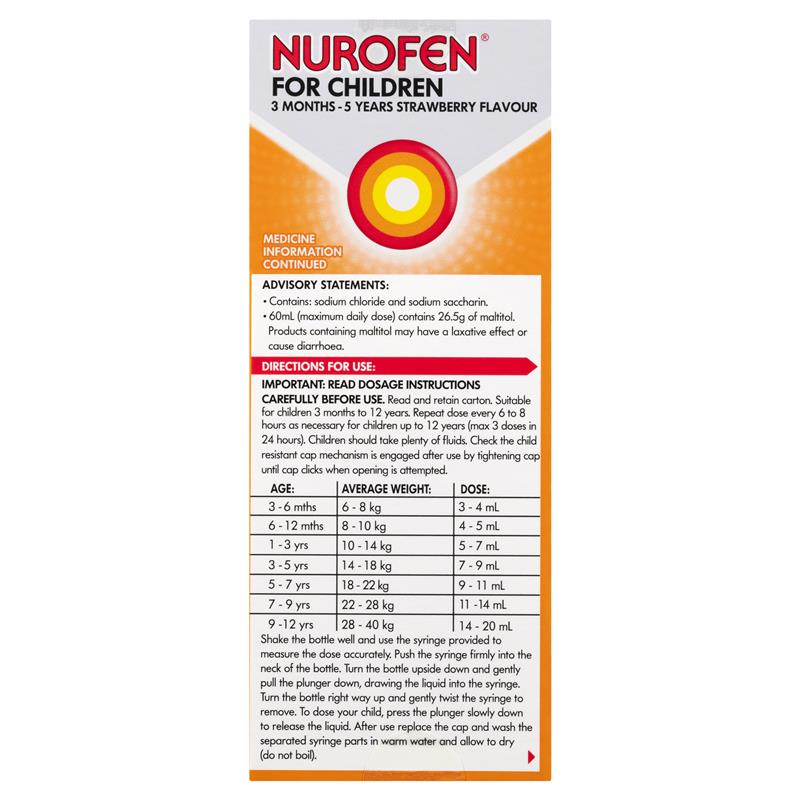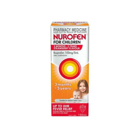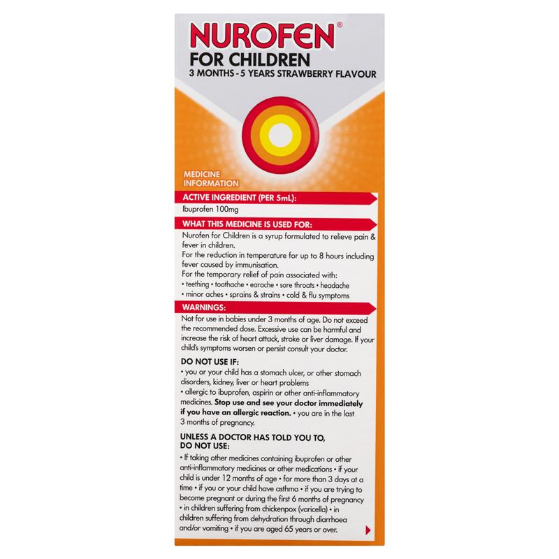 Nurofen Children 3 Months To 5 Years Strawberry Suspension Pain & Fever Relief is an ibuprofen formula providing up to 8 hour fever relief for your child, that can be taken on empty tummies. You do the fun and games, we’ll do the up to 8 hour fever relief.