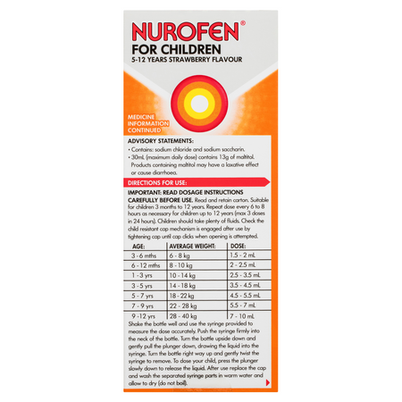 Nurofen Children 5 Years To 12 Years Strawberry Suspension Pain & Fever Relief is an ibuprofen formula providing up to 8 hour fever relief for your child, that can be taken on empty tummies. You do the fun and games, we’ll do the up to 8 hour fever relief.