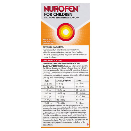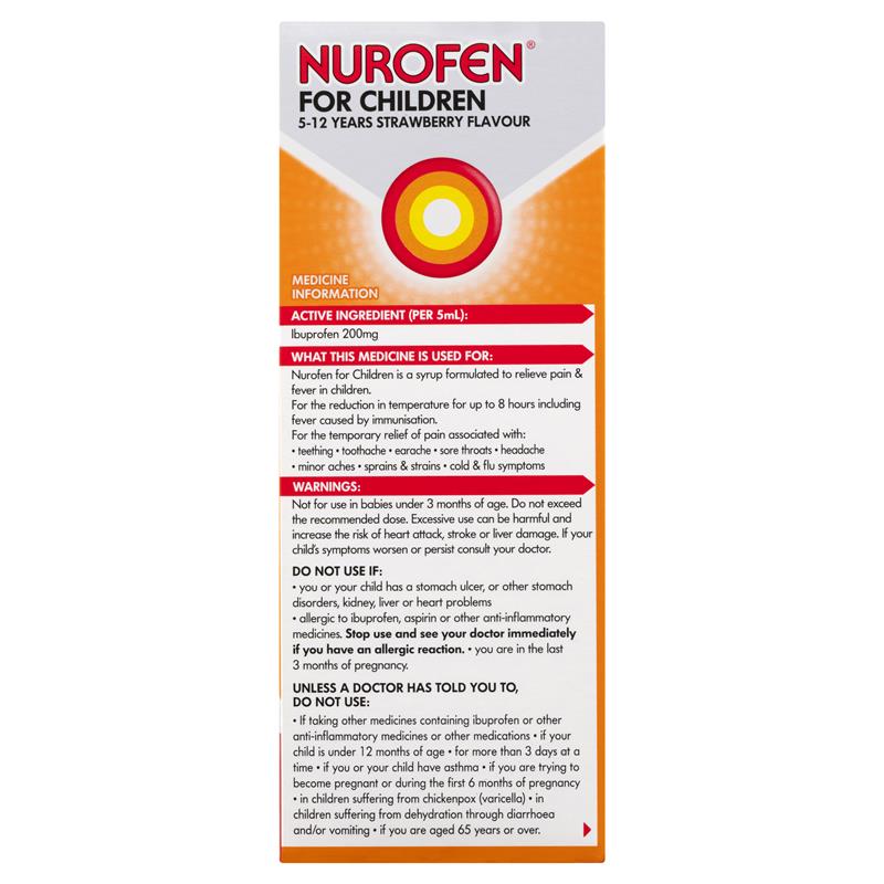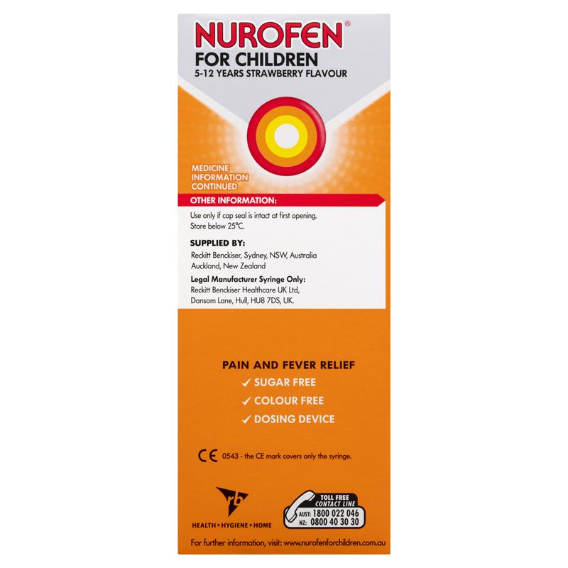 Nurofen Children 5 Years To 12 Years Strawberry Suspension Pain & Fever Relief is an ibuprofen formula providing up to 8 hour fever relief for your child, that can be taken on empty tummies. You do the fun and games, we’ll do the up to 8 hour fever relief.