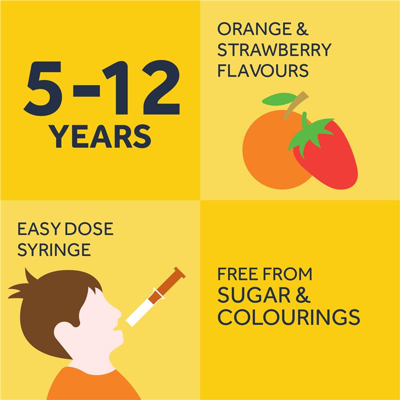 Shake the bottle well and use the syringe provided to measure the dose accurately. Push the syringe firmly into the neck of the bottle. Turn the bottle upside down and gently pull the plunger down, drawing the liquid into the syringe. Turn the bottle right way up and gently twist the syringe to remove. To dose your child, press the plunge slowly down to release the liquid. After use replace the cap and wash the separated syringe parts in warm water and allow to dry (do not boil).