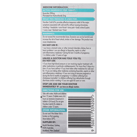 Nurofen Cold and Flu tablets provide effective, temporary relief of the major symptoms associated with cold and flu without causing drowsiness including: