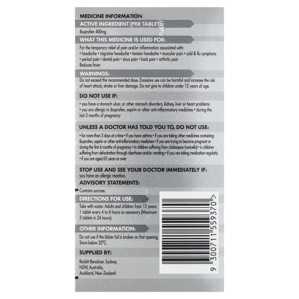 Active Ingredient (per tablet): Ibuprofen 400mg.