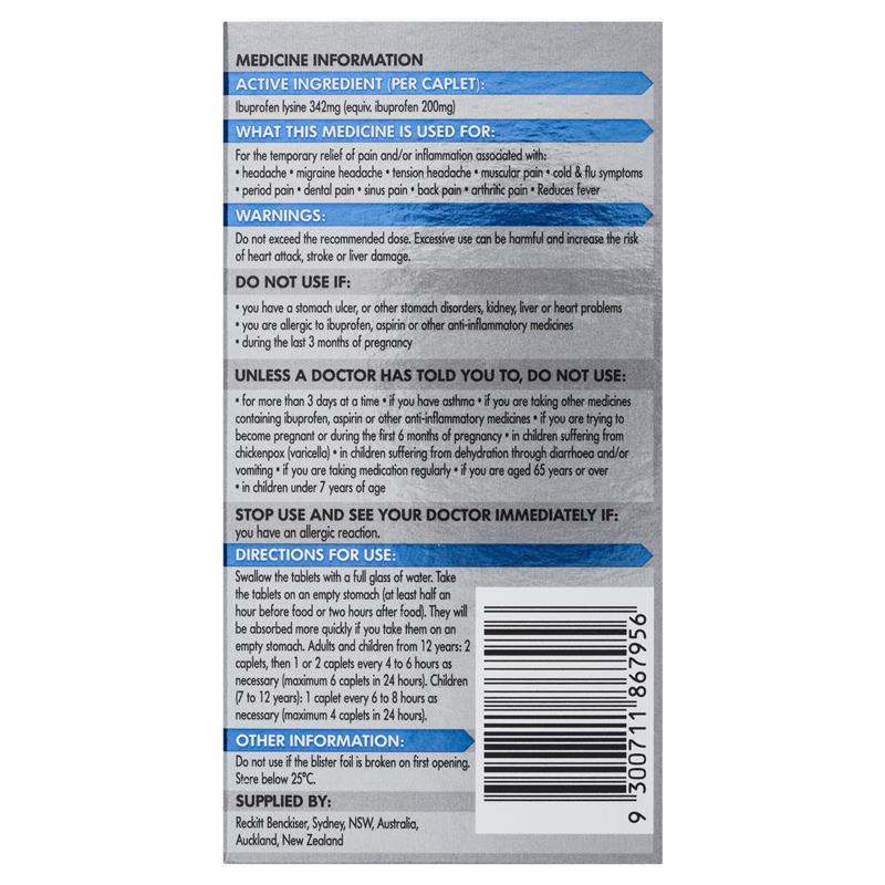 Active Ingredient (per caplet): Ibuprofen lysine 342mg (equiv. ibuprofen 200mg).