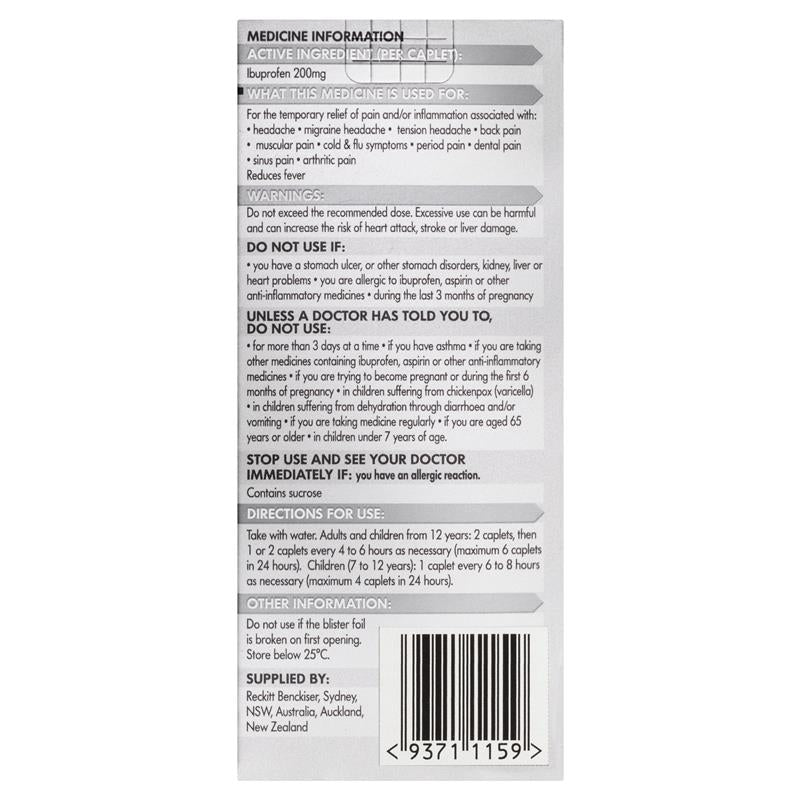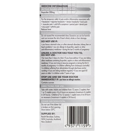 Active Ingredient (per caplet): Ibuprofen 200mg.