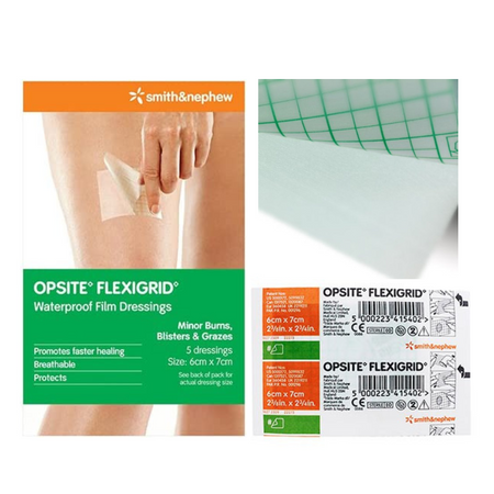 OPSITE Flexigrid Clear Barrier Wound Film, is a clear adhesive waterproof and bacteria-proof film dressing with a unique wound measurement grid. The film is moisture vapour permeable, conformable and extensible.