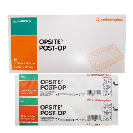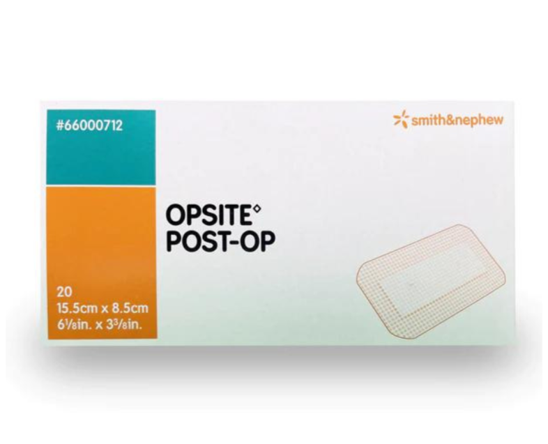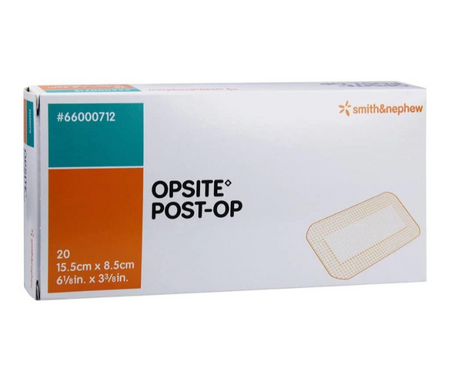 OPSITE Post-Op Absorbent Film Dressings, feature a clear film surrounding an absorbent pad. This waterproof dressing provides a bacteria-proof barrier for low-risk infections, cuts, grazes, and stitches, and helps reduce the risk of secondary infections. The dressing is breathable and can stay in place for up to 7 days.