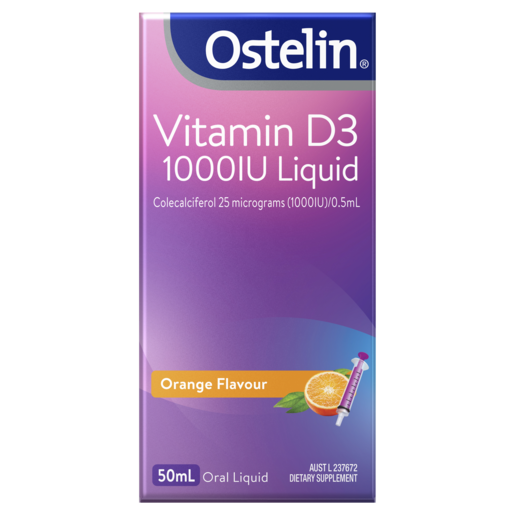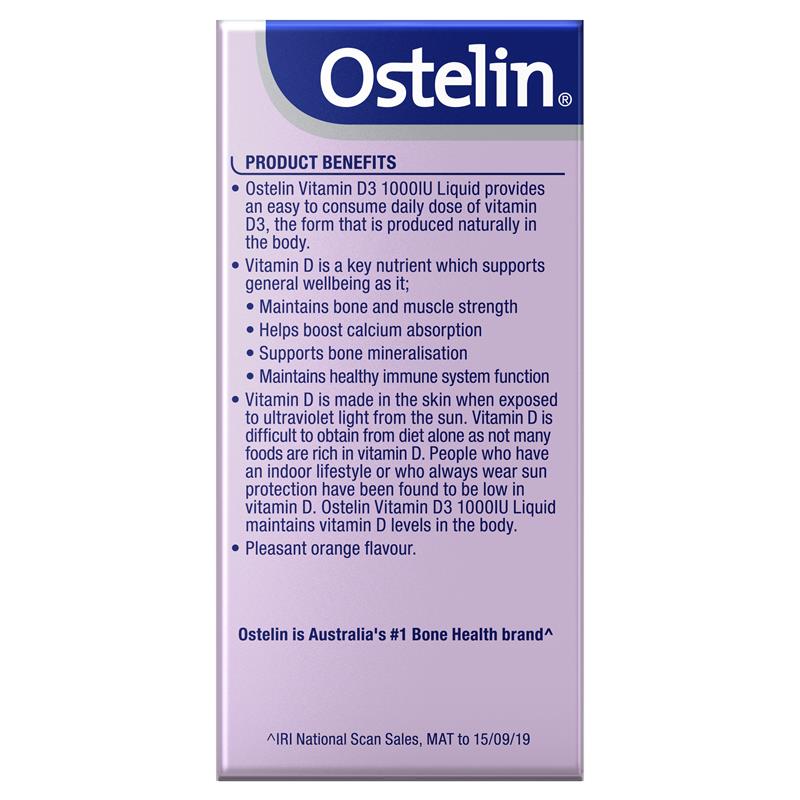 Ostelin Vitamin D3 1000IU Liquid provides an easy to use daily dose of vitamin D3, the form that is naturally produced in the body. Each dosage contains Colecalciferol 25 micrograms (1000IU) / 0.5mL. Vitamin D3 boosts calcium absorption for strong, healthy bones.