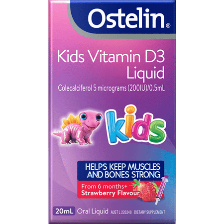 Ostelin Kids Vitamin D3 Liquid provides a tailored dose of vitamin D3 and comes in a pleasant strawberry flavour that kids enjoy. This product is suitable for maintaining adequate vitamin D levels in children aged 6+ months and may assist in the prevention of vitamin D deficiency when dietary intake is inadequate. Each small 0.5mL dose provides 200IU of vitamin D3 (Colecalciferol 5 micrograms), the form naturally found in the body, blended with premium quality fractionated coconut oil. It contains no added sugar and no artificial colours, flavours or preservatives. It also comes with a measuring dispenser for accurate dosing.