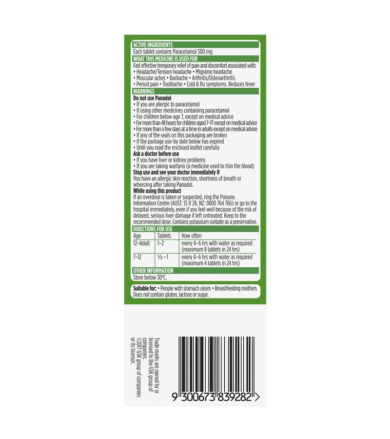 Panadol Tablets provide fast, effective temporary relief of pain and discomfort.