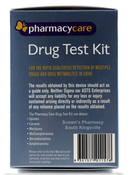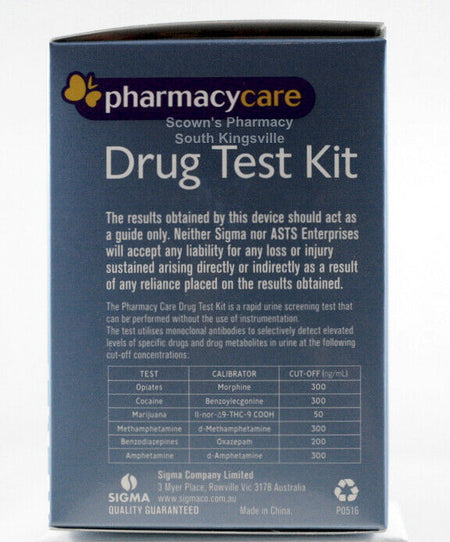 The Pharmacy Care Drug Test Kit can detect opiates, cocaine, marijuana, methamphetamine, benzodiazepines and amphetamines. The results obtained by this device should act as a guide only. Neither Scown's Pharmacy, its distributor or the manufacturer will accept any liability for any loss or injury sustained arising directly or indirectly as a result of any reliance placed on the results obtained.