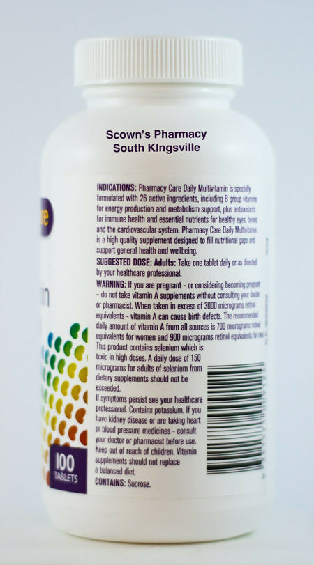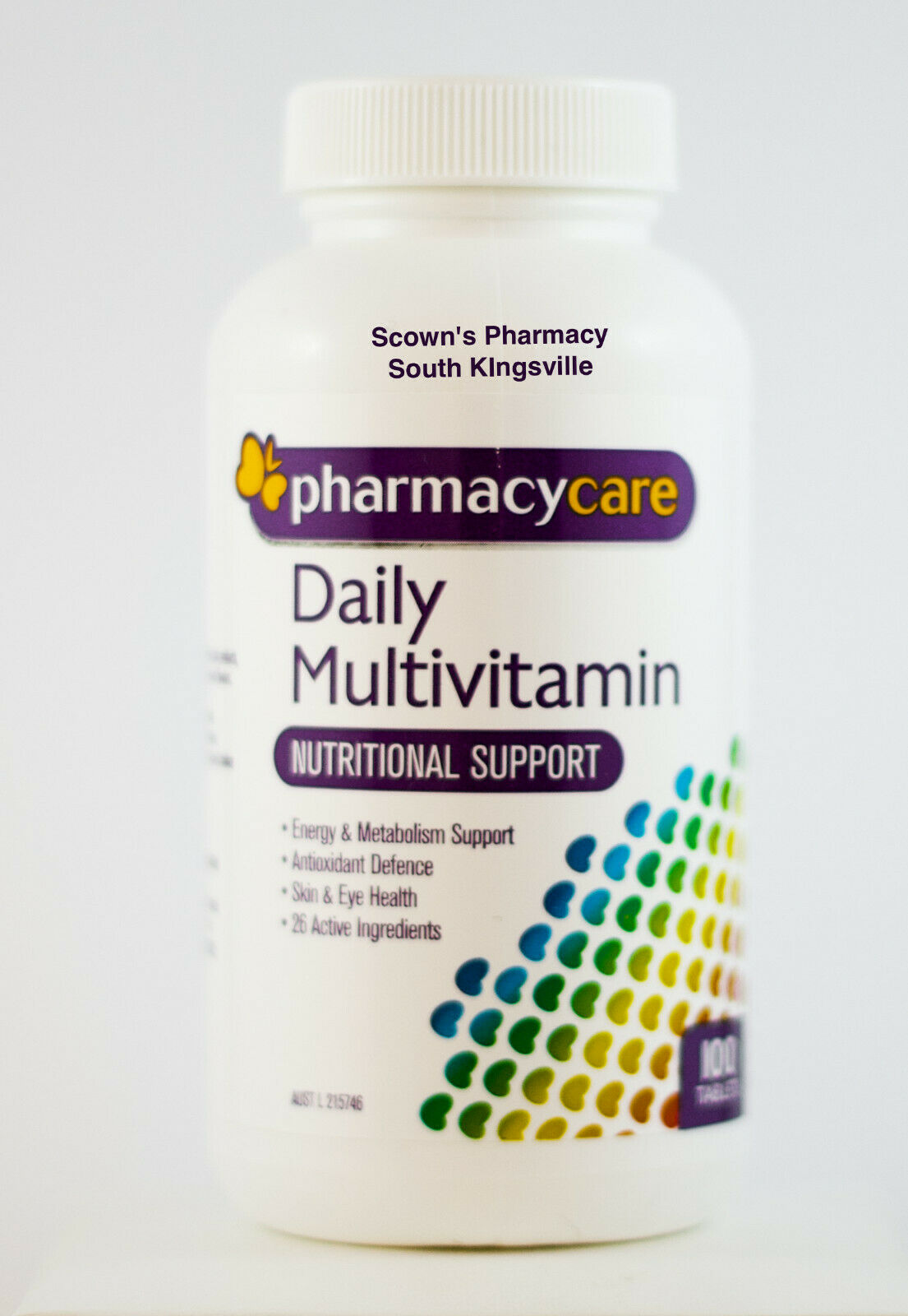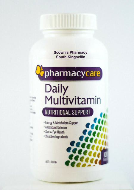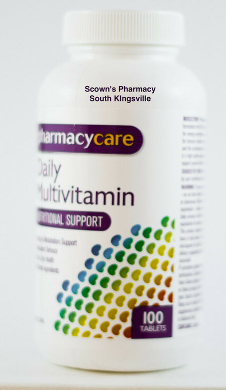Pharmacy Care Daily Multivitmanin is specially formulated with 26 active ingredients, incluidng C & B group vitamins for energy production and metabolism support, plus antioxidants for immune health and essential nutrients for healthy eyes, bones and teh cardiovascular system. Pharmacy Care Daily Multivitamin is a high quality supplement designed to fill nutrionial gaps and support general health and wellbeing.